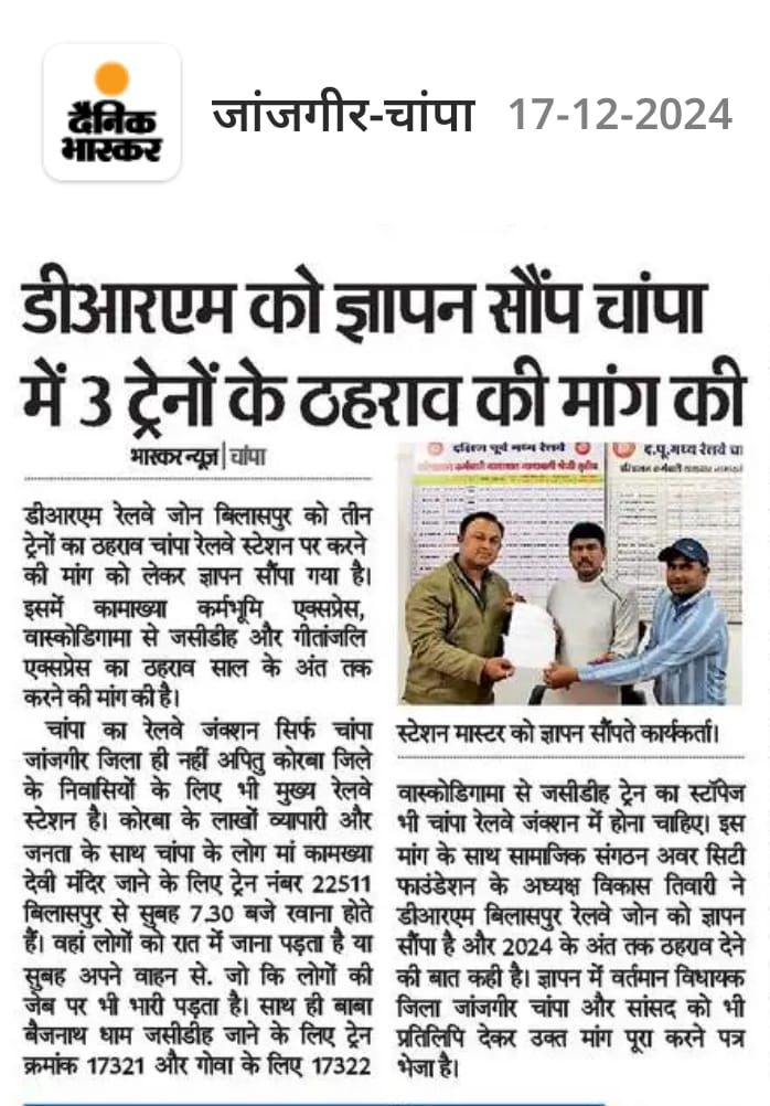 बड़ी विडंबना यह है कि जांजगीर चांपा विधायक अपने क्षेत्र की बात करते हैं और सांसद शक्ति स्टेशन की ।चांपा के हित में बोलने वालो का अकाल सा छा गया है ।अब देखना यह है कि कोरबा सांसद की मांग पर जीएम बिलासपुर कितना समय लेते हैं ।