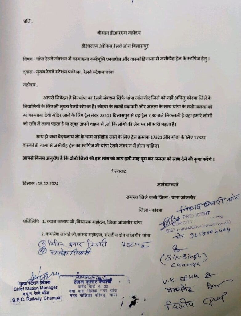 चांपा जंक्शन रेलवे स्टेशन की बहुप्रतीक्षित मांग को शामिल करने विकास तिवारी और राजेश तिवारी ने सांसद जी से निवास पर जाकर इन मांगों को पुनः शामिल करने दिया था पत्र ,जिसपर मांगों को शामिल करने माननीय सांसद को बहुत बहुत धन्यवाद