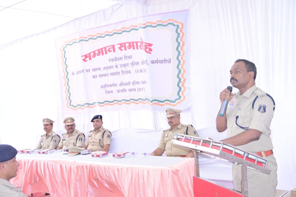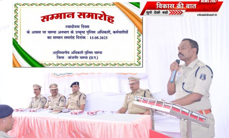 जांजगीर चांपा जिले के चांपा एसडीओपी कार्यालय में स्वतंत्रता दिवस के अवसर पर एक सम्मान समारोह का आयोजन किया गया। इस कार्यक्रम में अनुभाग क्षेत्र के अंतर्गत पुलिस अधिकारी और कर्मचारियों को उनके उत्कृष्ट कार्य एवं कर्तव्यनिष्ठा के लिए प्रशस्ति पत्र प्रदान कर सम्मानित किया गया।