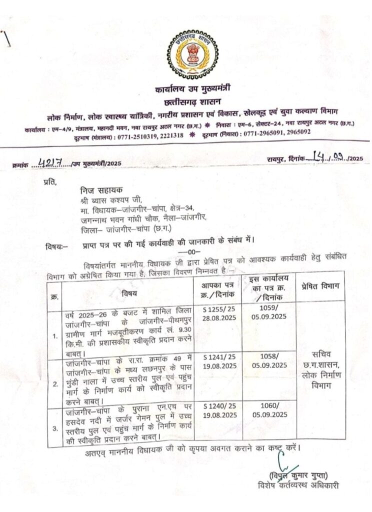 इसके बाद उन्होंने विभागीय मंत्री और सचिव से लगातार मुलाकात कर परियोजनाओं की प्रशासकीय मंजूरी दिलाई। राष्ट्रीय राजमार्ग क्रमांक 49 के तहत जांजगीर-चांपा के मध्य लछनपुर के पास घुंडी नाला में पुल निर्माण के लिए 5 करोड़ 41 लाख 10 हजार रुपए और पुराना एनएच पर हसदेव नदी में जर्जर गेमन उच्चस्तरीय पुल और पहुंच मार्ग निर्माण के लिए 15 करोड़ 86 लाख 75 हजार रुपए स्वीकृत किए गए हैं।
